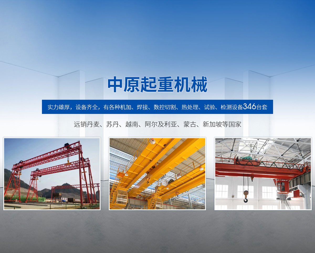 新鄉市中原起重機械有限公司成立于2000年,地處中原,輻射全國28個省市自治區,設外埠經銷處、辦事處268個。產品行銷工礦、建材、化工、冶金、電力、交通、鐵路、油田、港口等各個行業。遠銷丹麥、蘇丹、越南、阿爾及利亞、蒙古、新加坡等國家?! 」緦嵙π酆?,設備齊全,有各種機加、焊接、數控切割、熱處理、試驗、檢測設備7臺;有機加工、熱處理、單、雙梁橋門機生產、檢測、安裝等9個車間,研究中心、運輸公司、安裝維修服務公司等機構,?  主要產品有:LD型1~20噸電動單梁起重機系列產品;5~600噸通用橋式、門式、冶金、上旋轉下旋轉電磁吊、絕緣、抓斗、防爆起重機系列產品;LH3~100噸葫蘆雙梁系列產品;MH5~32噸葫蘆門式系列產品;0.5~40噸CD1、MD1鋼絲繩電葫蘆系列產品;HS1型0.5~20噸手動葫蘆系列產品;0.5~10噸環鏈電動葫蘆系列;0.5~40噸彎道電動葫蘆系列產品;裝卸橋、造船門機、架橋機、鑄造吊和水電大噸位起重機系列產品?! 」窘⒘藦娪辛Φ馁|量保證體系和生產過程的質量控制系統,嚴格執行國家設計、生產標準,有嚴格的生產工藝過程和標準,嚴格的檢驗、檢測標準和手段。